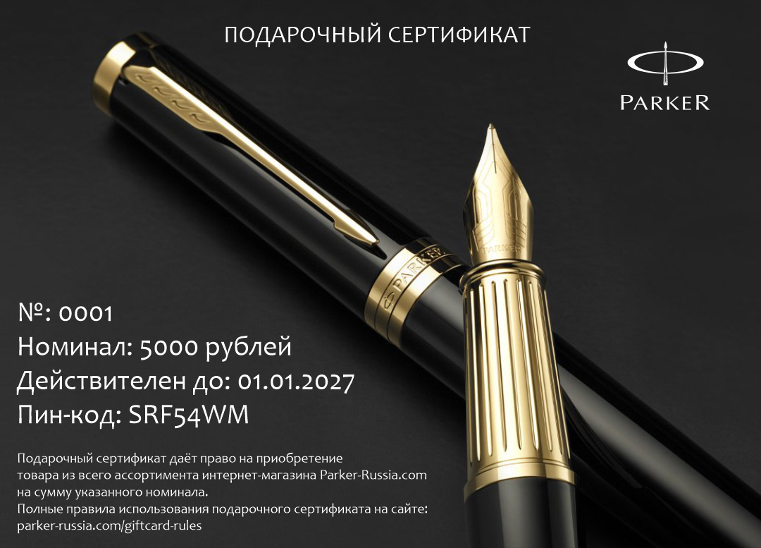 Подарочный сертификат Parker 10000 от официального дилера Parker в Дзержинске. Вы можете дополнительно заказать гравировку, которая подчеркнет Вашу оригинальность и придаст памятность статусному подарку. Все ручки Паркер поставляются в фирменном футляре.
